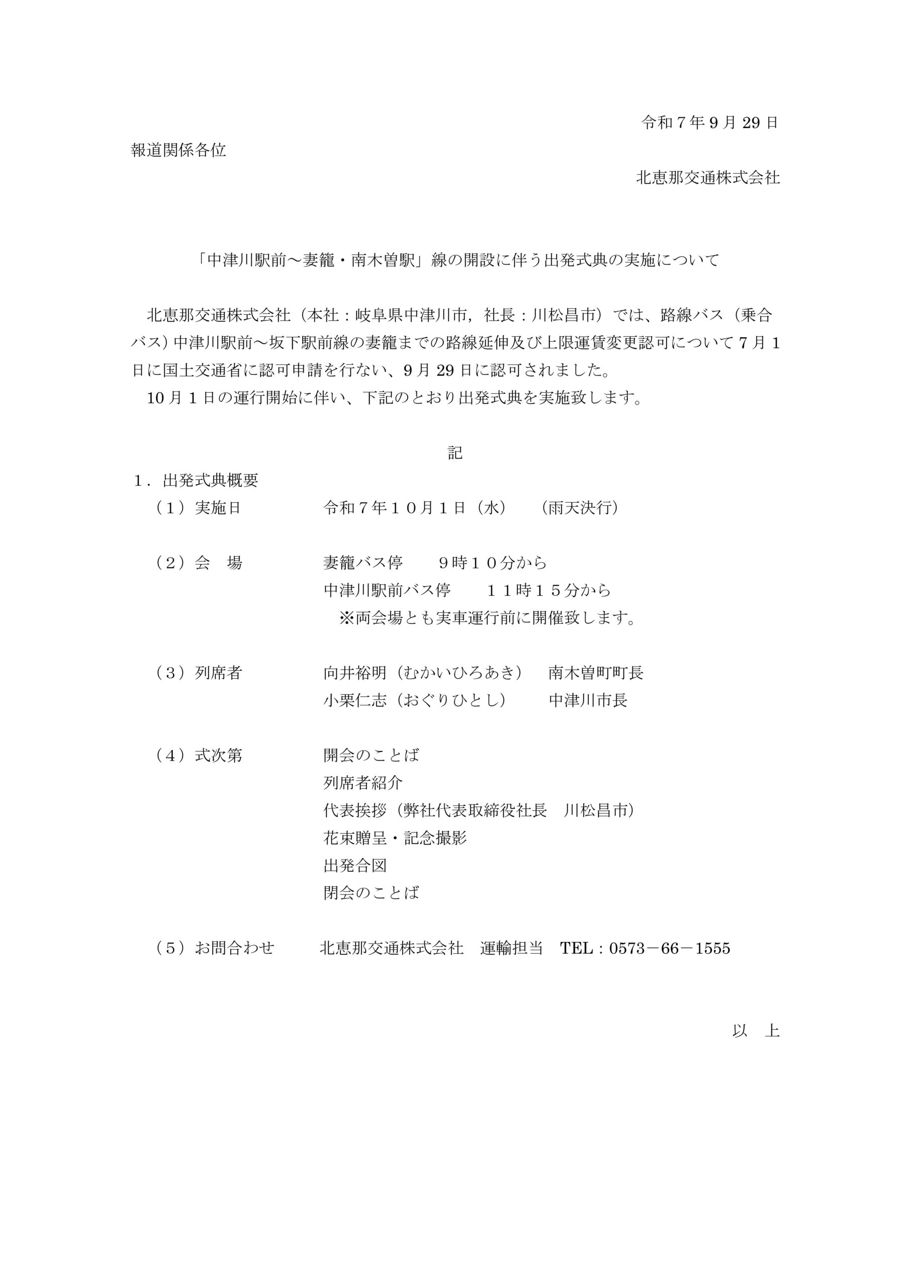 「中津川駅前~妻籠・南木曽駅」線出発式典の実施について 2025.09.29 中津川駅前~坂下駅前線の妻籠までの路線延伸について、国土交通省より9月29日に認可されました。 10月1日の運行開始に伴い、下記のとおり出発式典を実施致します。 🚌2025.10.1 ダイヤ改正のお知らせ🚌前の記事 🌰第20回ふるさとじまん祭・第30回菓子まつり会場直行バスのお知らせ🌰次の記事