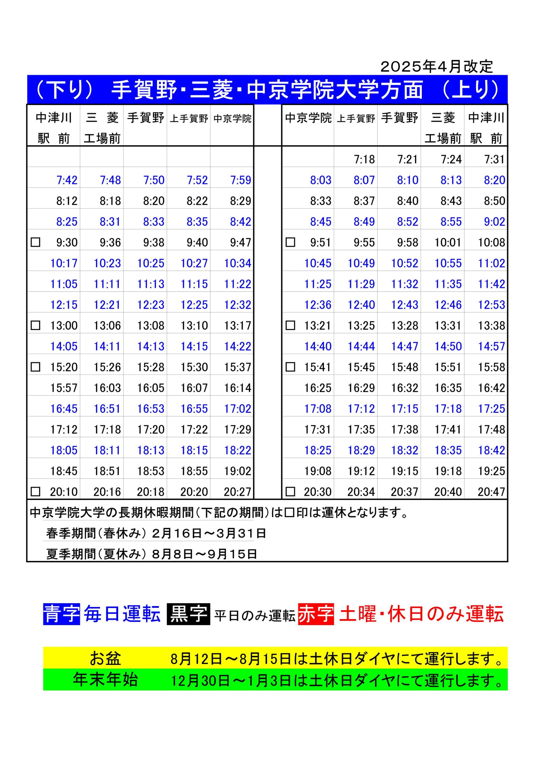手賀野線 中京学院大学春季長期休暇期間の運行のお知らせ 2026.02.13 いつも北恵那バスをご利用いただきありがとうございます。 恵那線 三菱・手賀野・中京学院大学方面は、中京学院大学の春季長期休暇期間 『令和8年2月16日(月)~令和8年3月31日(火)』 は下記の時刻表の▢印は運休となります。 ご不便をお掛けいたしますが、よろしくお願いいたします。 手賀野 中京学院大学方面 時刻表 「馬籠・妻籠 周遊切符」📱モバイルチケット販売開始のお知らせ前の記事