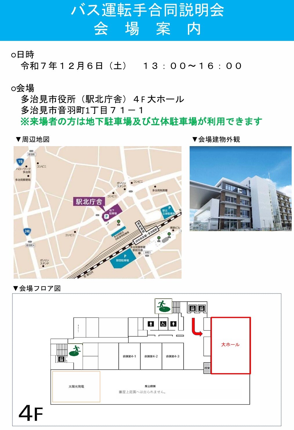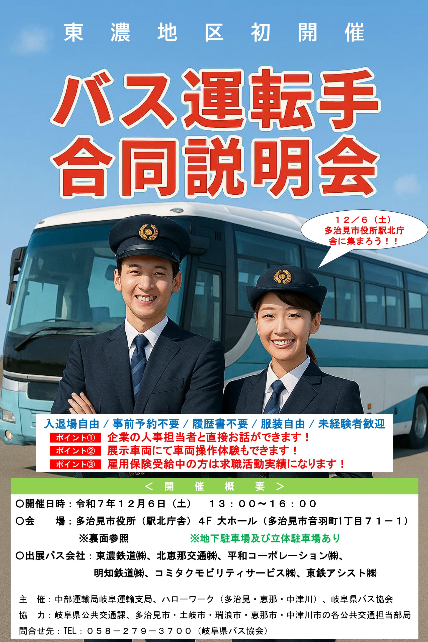 2025年12月6日 東濃地区 バス運転手合同説明会 参加のお知らせ 2025.11.18 2025年12月6日(土)に多治見市役所で開催される「バス運転手合同説明会」に参加いたします。 日時:2025年12月6日(土) 13:00~16:00 会場:多治見市役所(4階大ホール)*駐車場有 「馬籠・妻籠 周遊切符」📱モバイルチケット販売開始のお知らせ前の記事